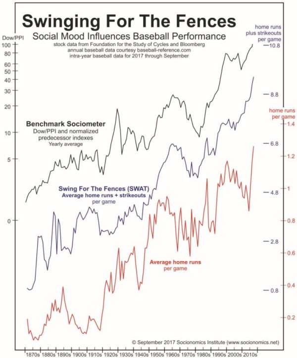 Robert Prechter's socionomic theory sees stock market indexes as more than just financial indicators. They are also indicators of changes in society's optimism and pessimism, our social mood. Positive mood produces optimism, confidence and stock market advances. Negative mood produces pessimism, fear and stock market declines. The same seems to be true for baseball performance.