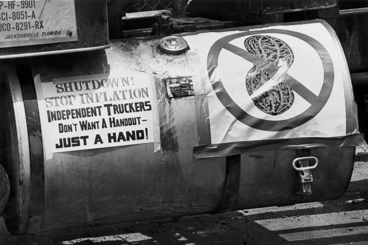 A sign about inflation on a gasoline tank during a trucker demonstration in Chelsea, Mass., June 27, 1979. Photo: Boston Globe via Getty Images